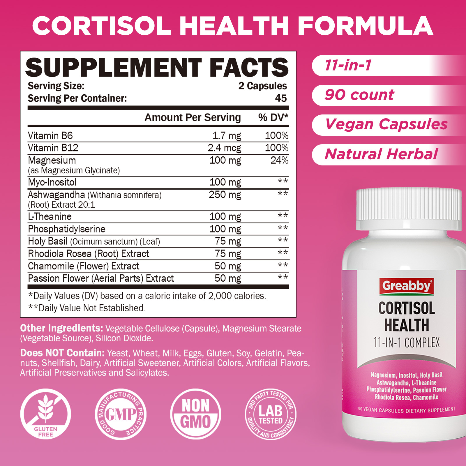 • 11-in-1 Cortisol Supplements for Women: Greabby cortisol health blend contains 11 ingredients in each capsule. These ingredients help naturally lower cortisol levels, relieve stress, and promote energy in women