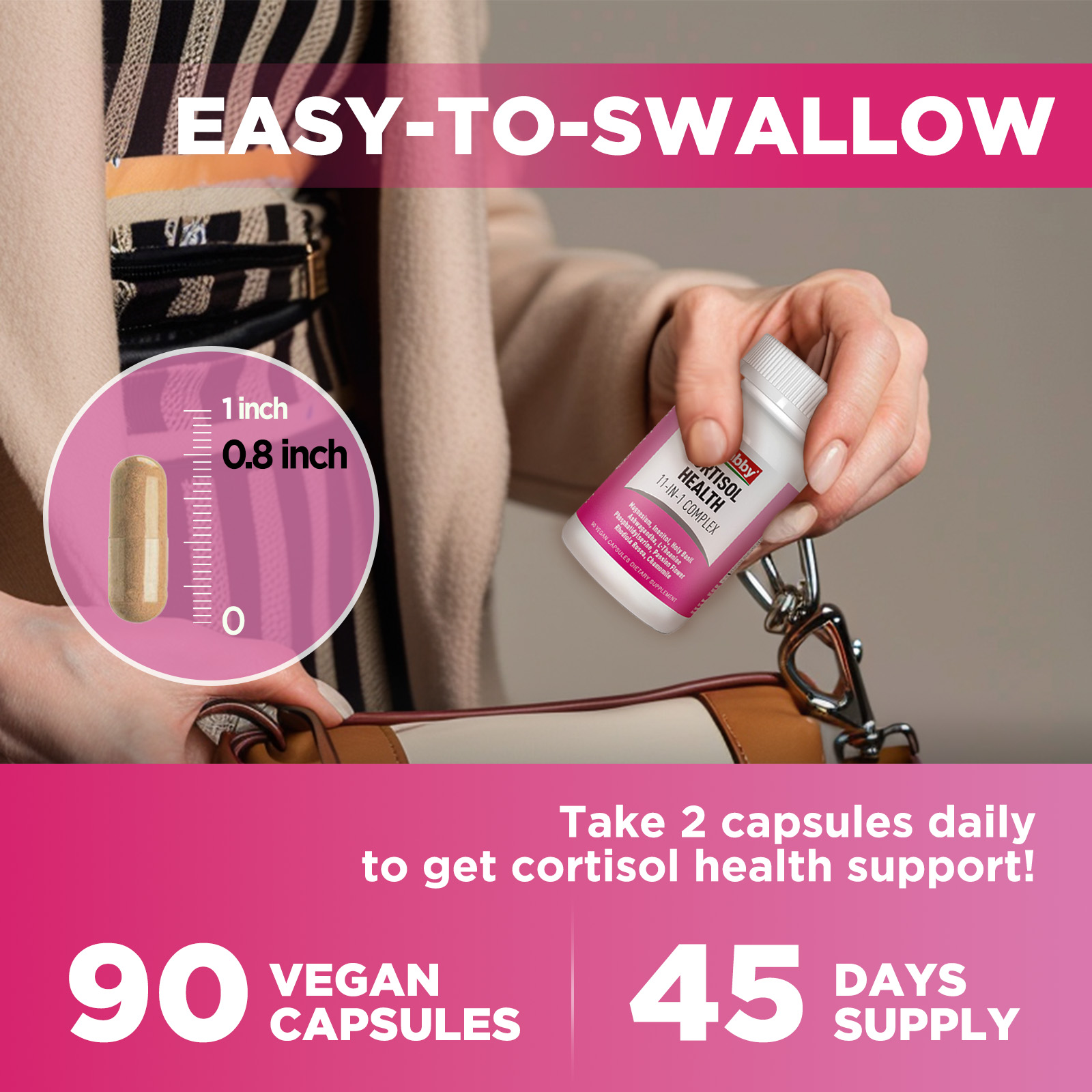 • Small Size Vegan Capsules: 0’ size vegan cortisol capsules supplement, easy to swallow. These 90 vegan capsules are gluten-free, non-GMO, and free from artificial additives – ideal for daily stress management