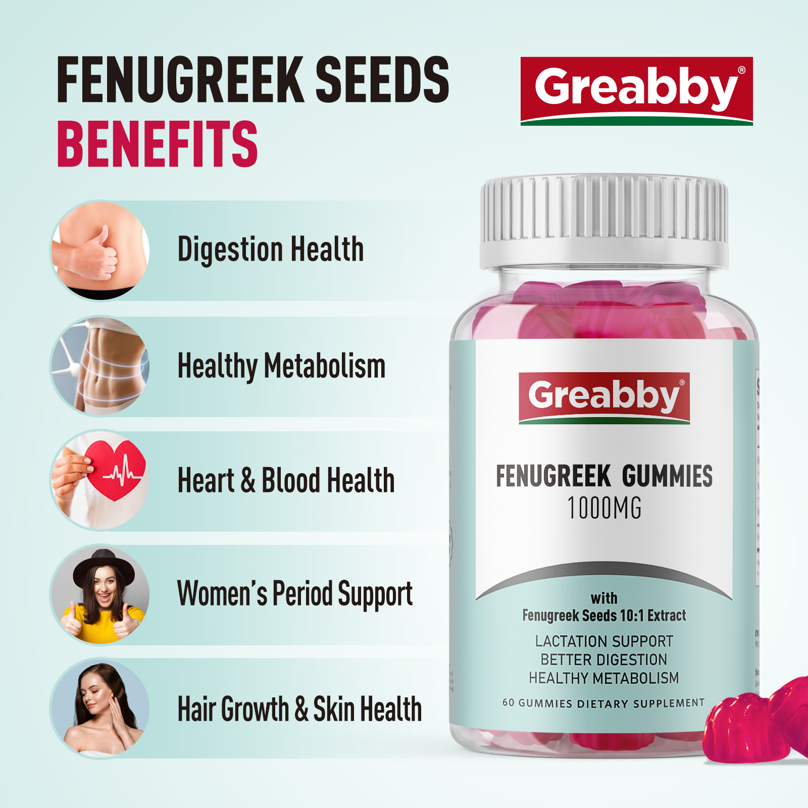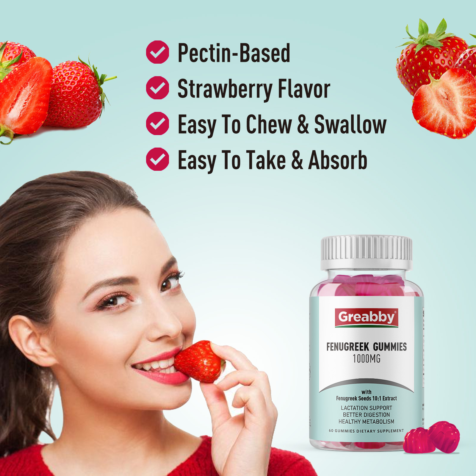 • Fenugreek Gummies. Greabby fenugreek chewables are pectin-based, no gelatin and no artificial added. Our fenugreek gummies are produced in a GMP-certified factory, safe and effective. Vegan, Organic, GMO-free.
