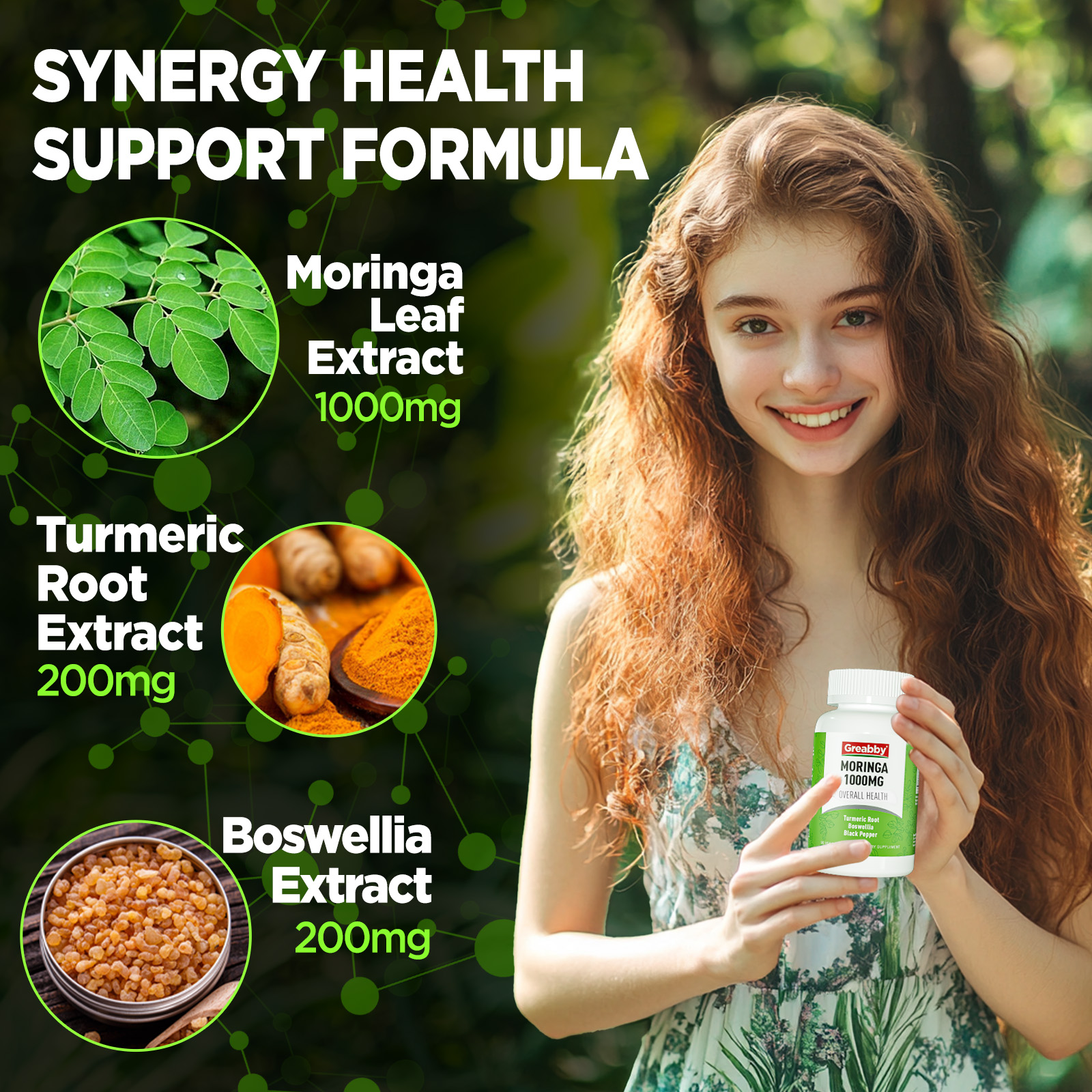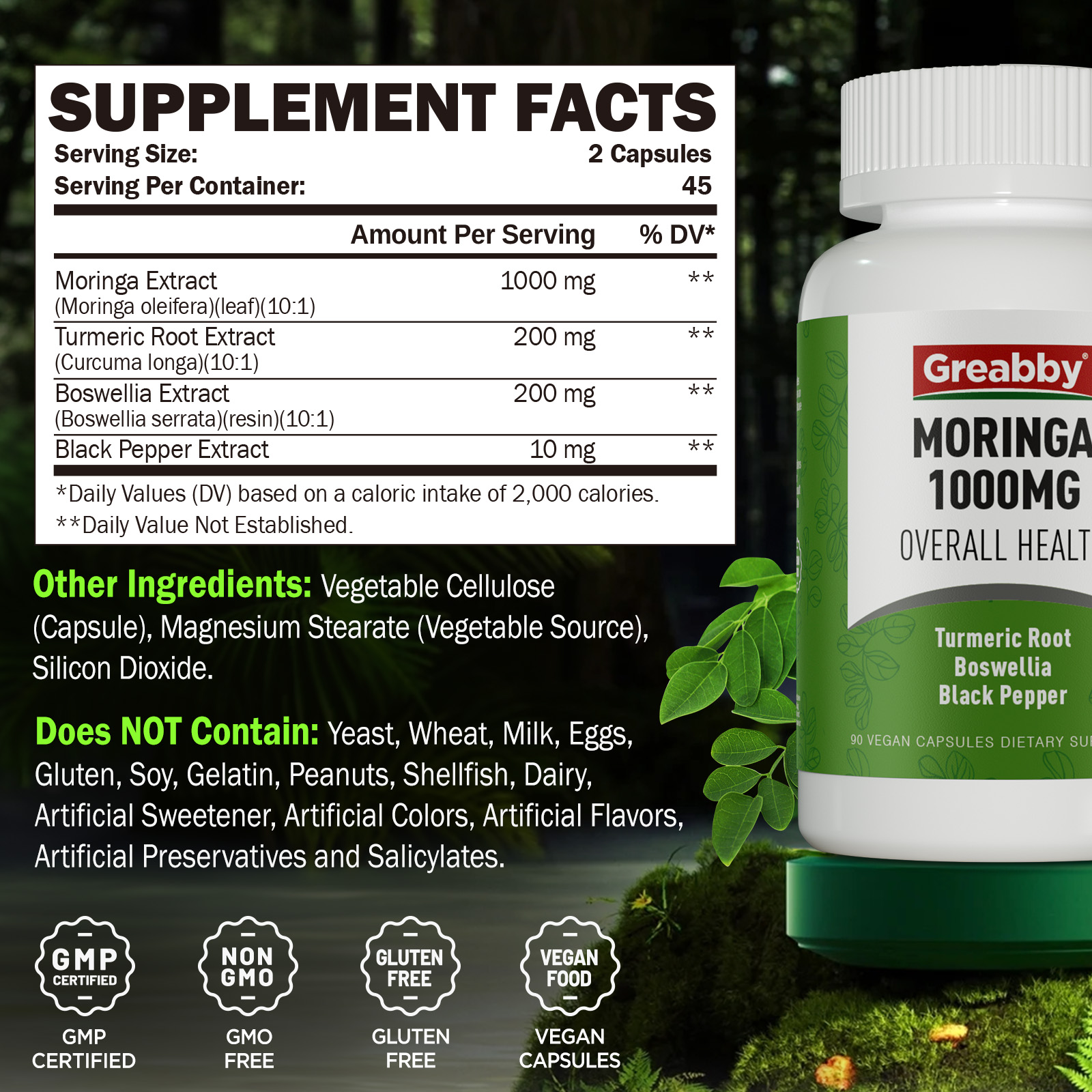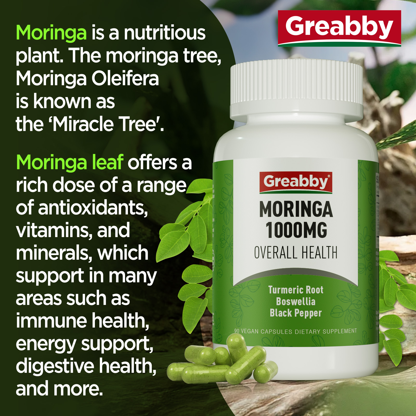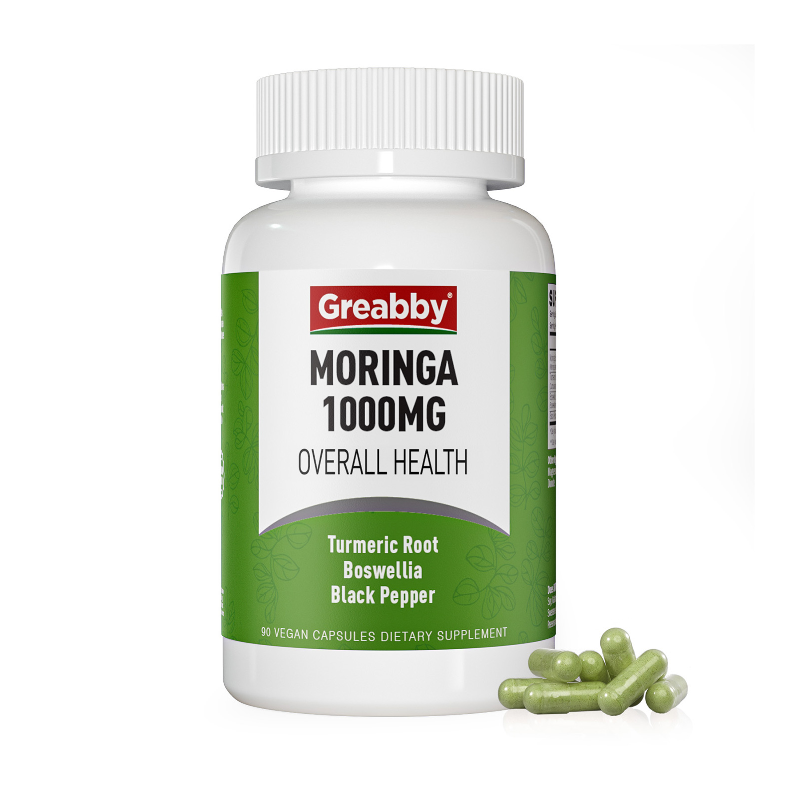 • Turmeric & Boswellia Supply. Every 2 of Greabby Moringa Capsules also combines 200mg turmeric (with curcumin) and 200mg Boswellia extract. Moringa is rich in dietary fiber, Turmeric promotes digestion, Boswellia supports intestinal function, and all three work together to support digestive health and metabolism