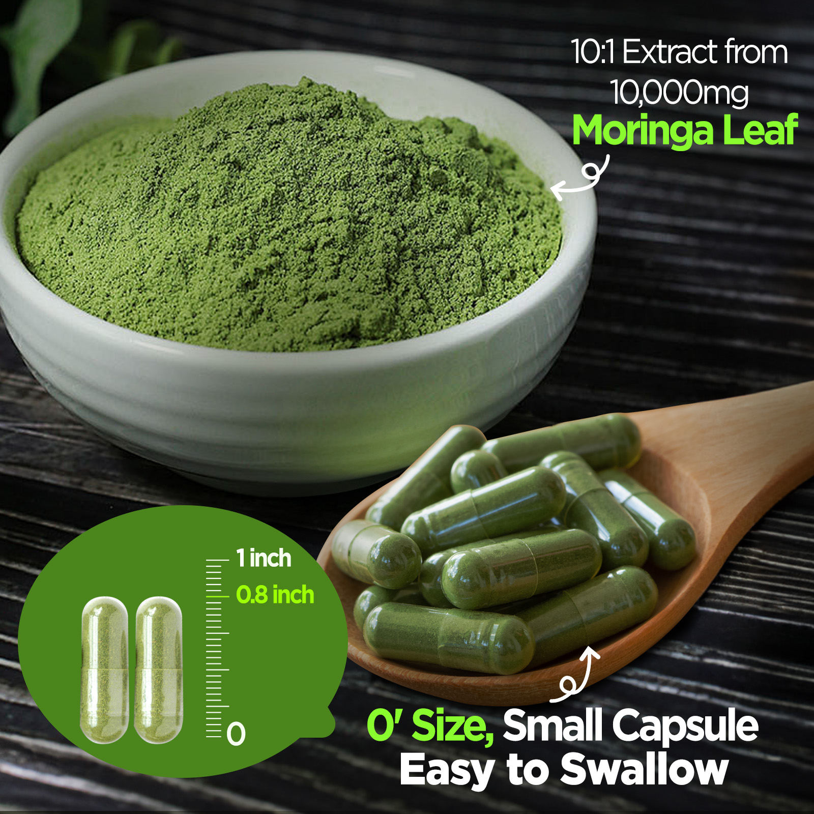 • Moringa Leaf 10:1 Extract 1000mg. Moringa is rich in protein, vitamins and minerals, especially vitamin C and calcium, as known as the ‘Miracle Tree’. Taking these Moringa capsules every day can provide the body with extra energy and immune support