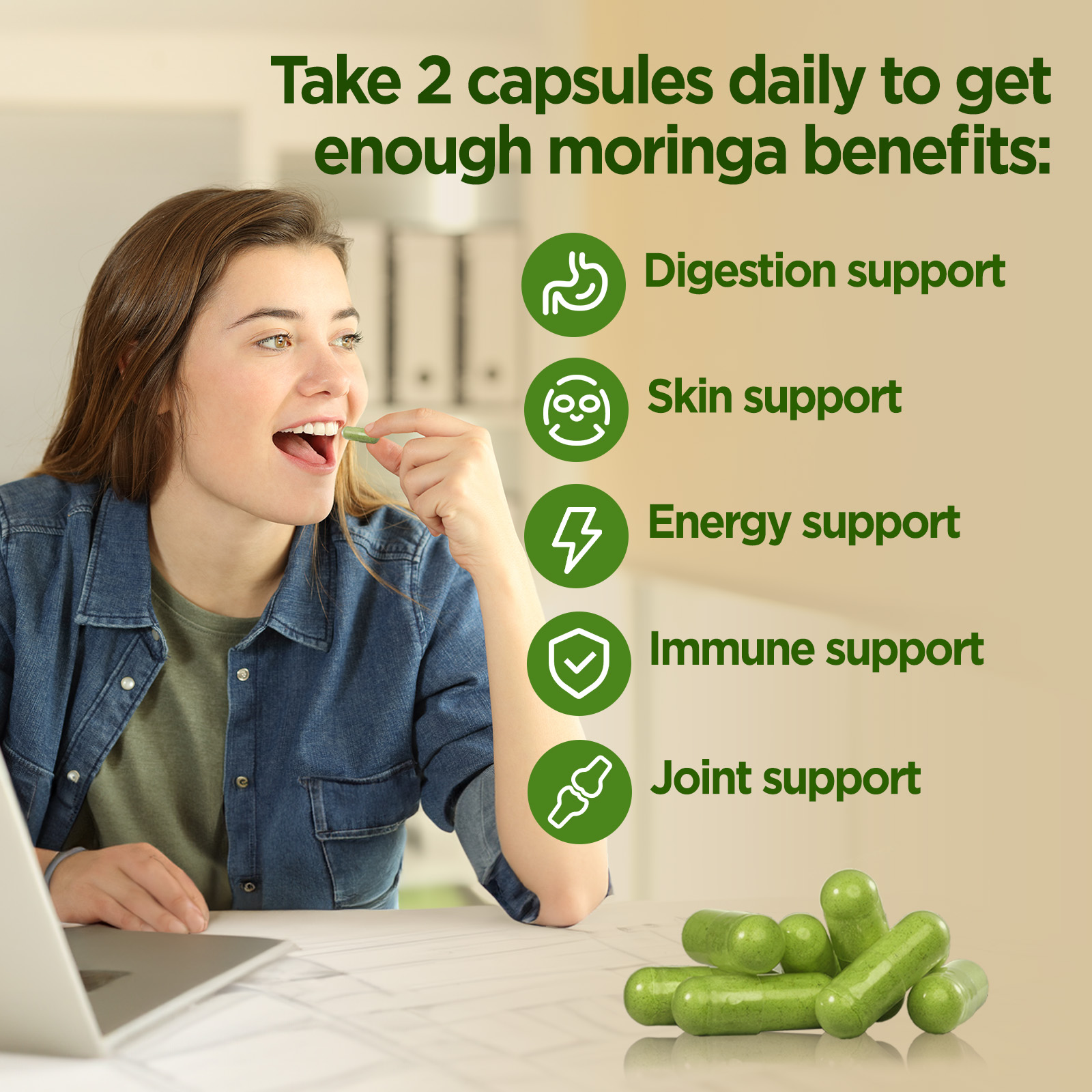 • 90 Small Size Capsules, Easy to Swallow. We recommend taking 2 capsules daily to get enough moringa benefits. 2 small-sized size easy to swallow capsules, help you stay energized and maintain overall vitality. Each bottle for 45 days supply, paired with eco-conscious packaging
