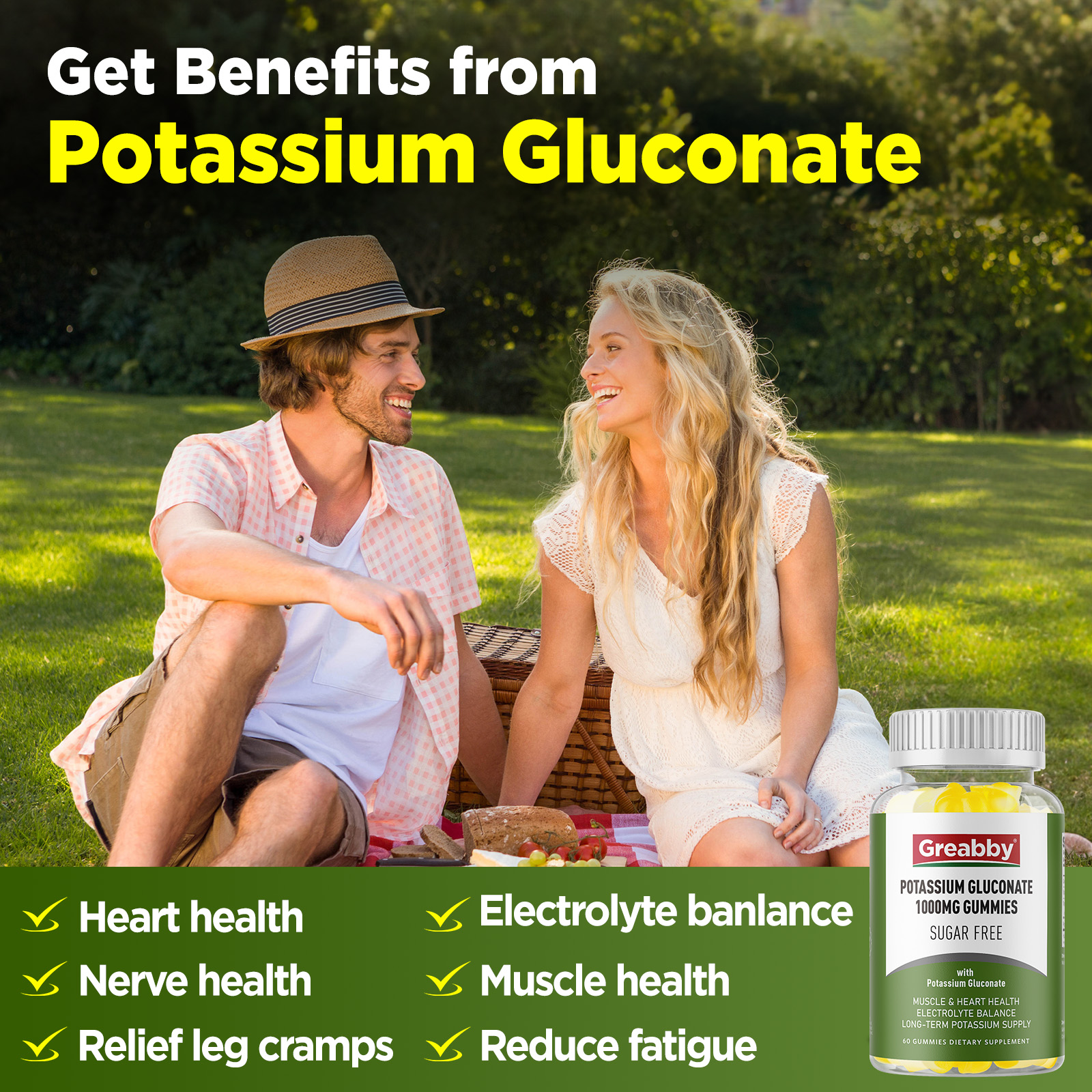 - Potassium Gluconate: Gentle & Sustained-Release Potassium Supply. Potassium gluconate helps body with a gradual and consistent absorption of potassium throughout the day to maintain optimal electrolyte balance and health, a better potassium gummies supplement