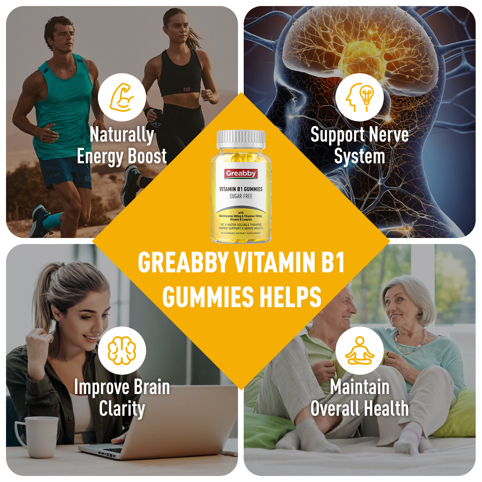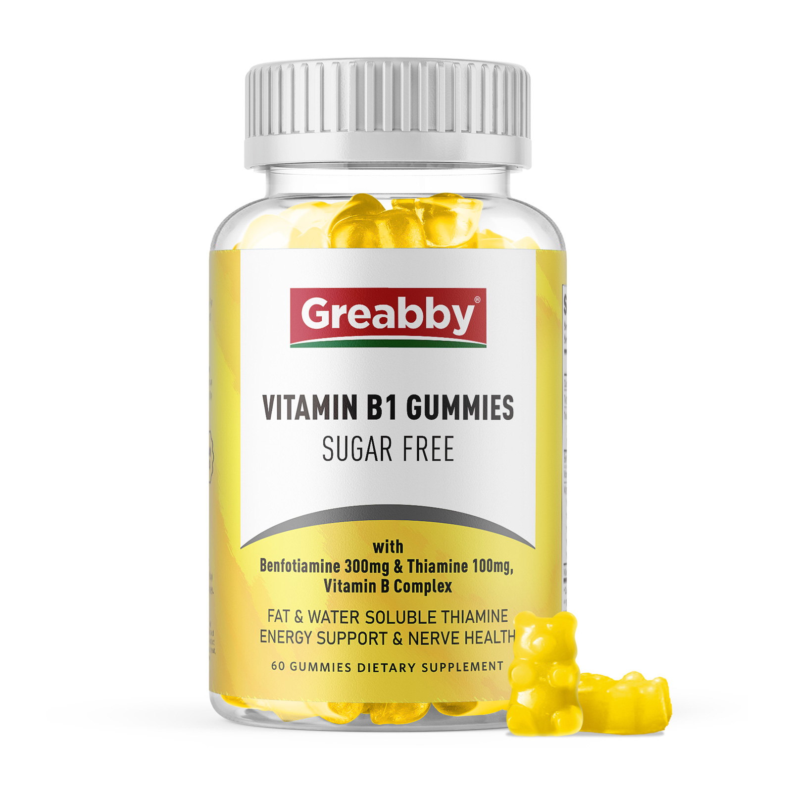 - Nature & Organic. Greabby gummies are manufactured in a GMP-certified factory. All ingredients are vegan and GMO-free. Whether you’re a busy professional, or simply care for your family’s health, our delicious and easy-to-chew vitamin B1 gummies are an unworry health choice.