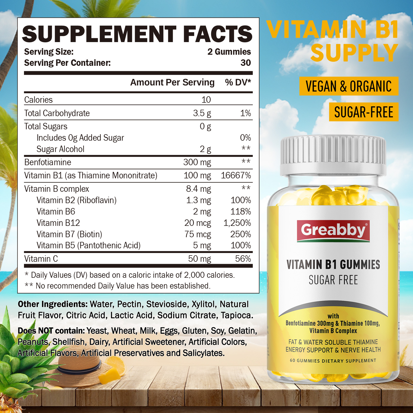 - Sugar-Free Vitamin B1 Gummies. Enjoy the benefits of these powerful vitamins without the added sugar! Greabby vitamin B1 gummies are naturally pineapple flavored and sweetened, providing a tasty and guilt-free way to take your vitamins every day.
