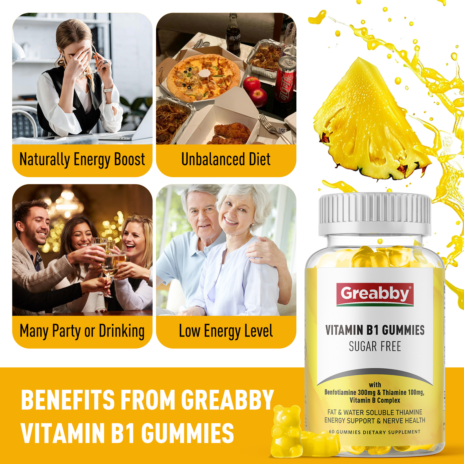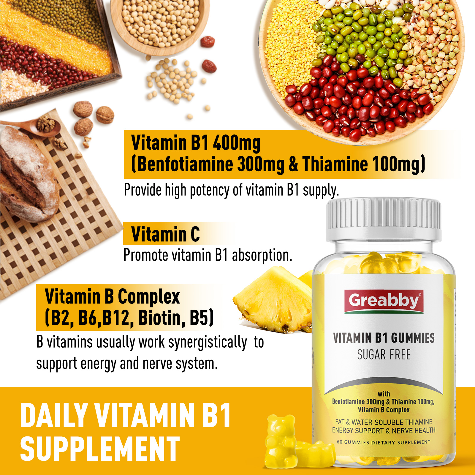 - Enhanced Energy Support. Boost your daily energy levels naturally with our potent Vitamin B1 gummies, designed to provide you with sustained energy throughout the day. Each serving delivers benfotiamine 300mg and thiamine 100mg, essential for converting food into energy.