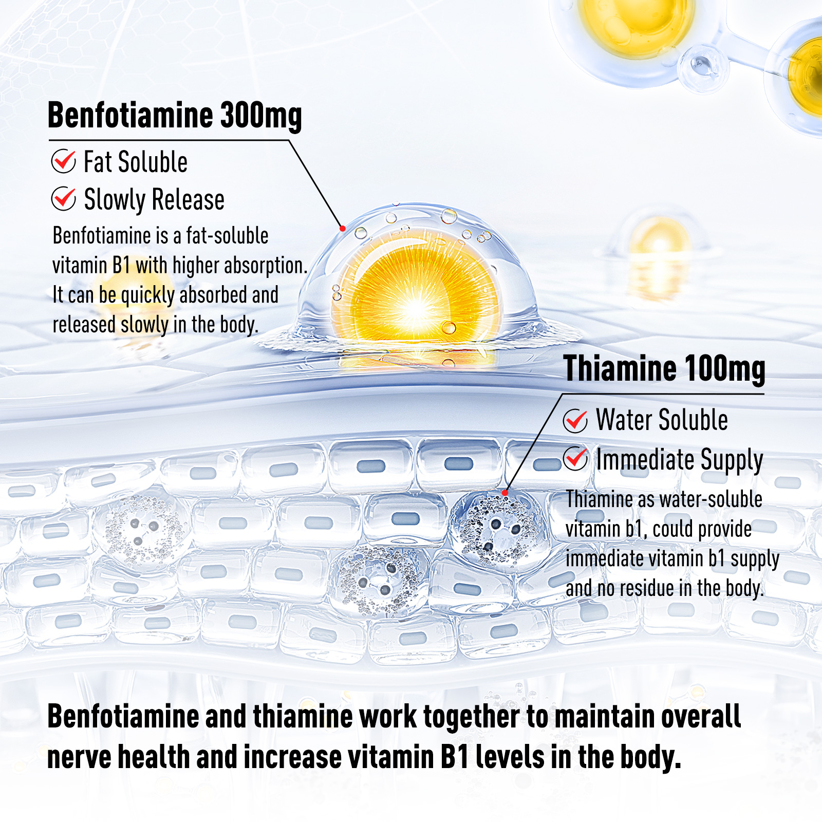 - Benfotiamine 300mg and Thiamine 100mg. The fat-soluble benfotiamine can be released slowly in the body, and the water-soluble thiamine serves as an immediate daily supplement. The two complements work together to maintain overall nerve health and increase vitamin B1 levels in the body.