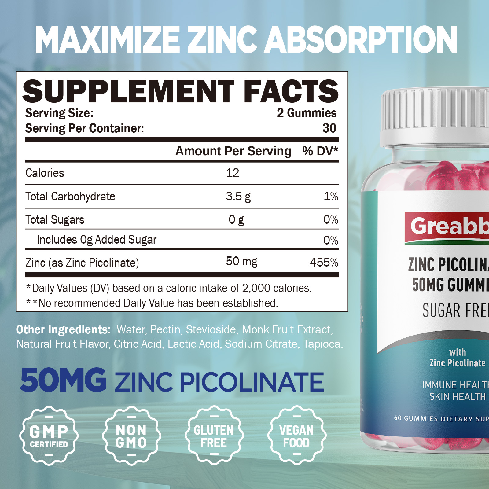 - Convenient & Tasty Gummies: Greabby zinc picolinate gummies are vegan and GMO-free, and manufactured in a GMP-certified factory. These tasty and chewable gummies make it easy and enjoyable to get your daily zinc intake